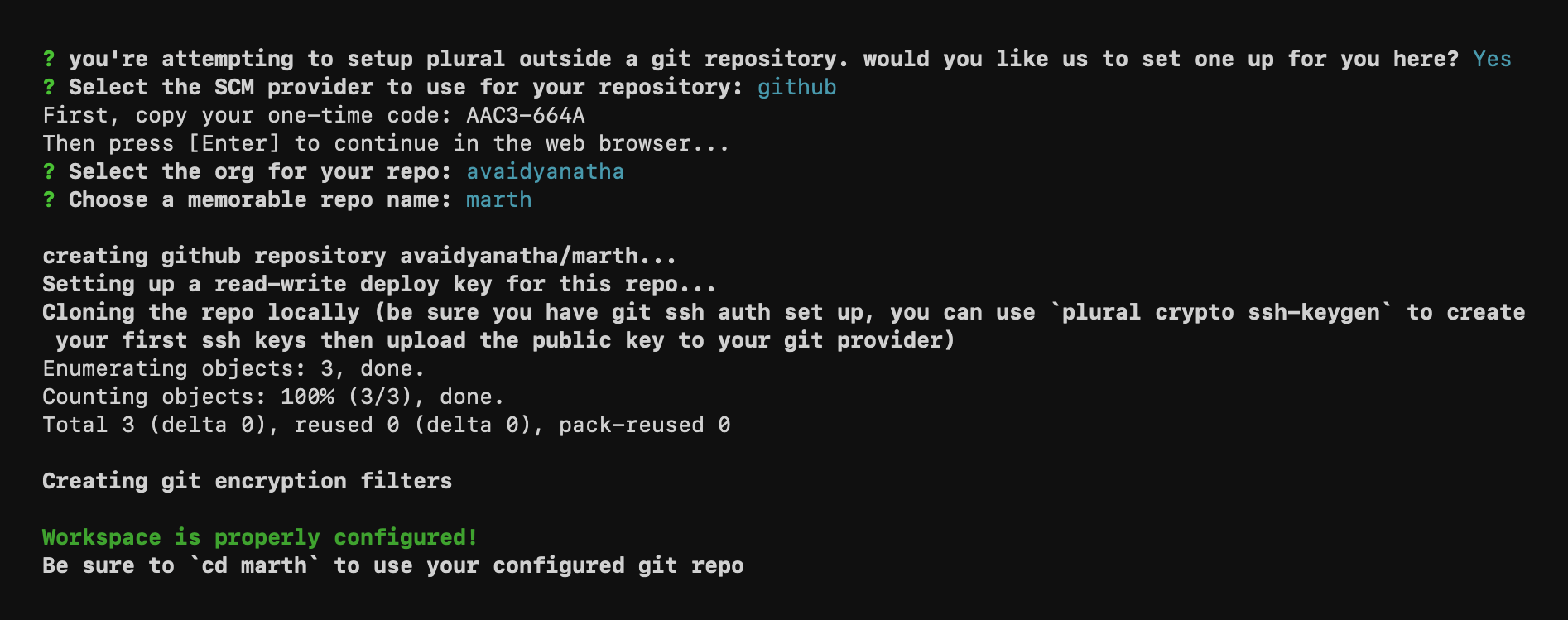This will kick off the process of setting up your Plural workspace. Once you've gone through a few setup steps, you'll get the following prompt: